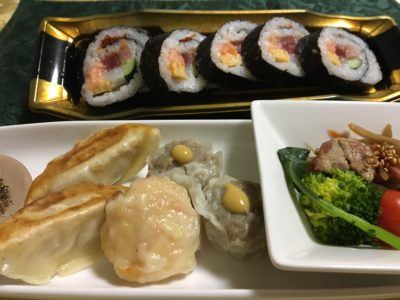 海鮮巻き寿司、金平ごぼう、ブロッコリーとプチトマト、餃子、焼売、海老餃子。