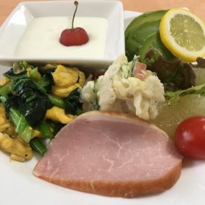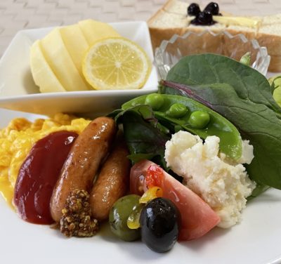 365日クッキング 3月10日の朝ごはん(オリーブのプロヴァンス風炒め) オリーブのプロヴァンス風炒め、スクランブルエッグ、ソーセージ、ポテトサラダとトマトにエンドウ、リーフサラダ、ヨーグルトとドライクランベリー、...