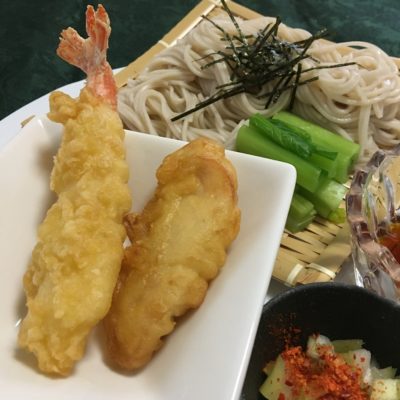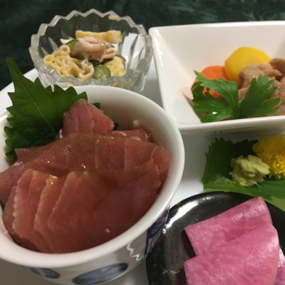 握り寿司(カンパチ、天然本鮪のネギトロ他)、黒胡麻豆腐とエンドウ、千切り長芋と紫大根のピクルス。