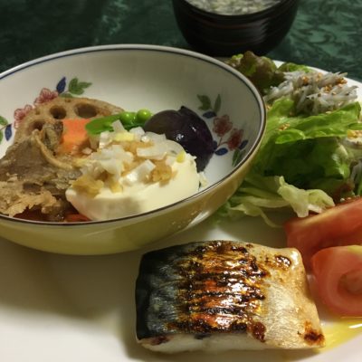鯖の西京味噌焼、豆腐と野菜の揚げだし、シラスサラダとトマト。