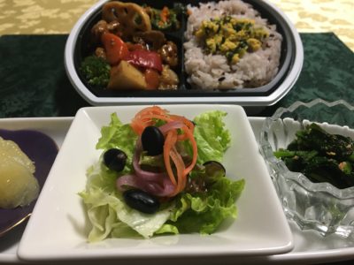 野菜サラダ、ほうれん草と若布のピーナッツ和え、グレープフルーツ、テイクアウトのお弁当。