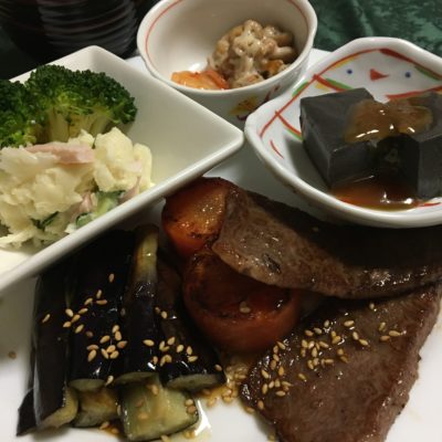 焼肉と焼野菜、ポテトサラダとブロッコリー、黒胡麻豆腐、キムチ納豆。