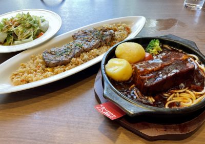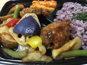 とんかつ、ポテトサラダ、野菜サラダ、カレーとブロッコリー。