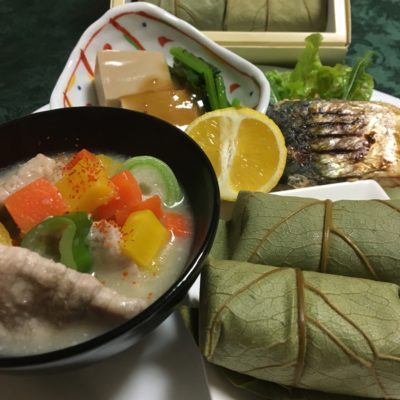 柿の葉寿司、豚汁、真鯖の塩焼、胡麻豆腐と小松菜のお浸し、黄金柑。
