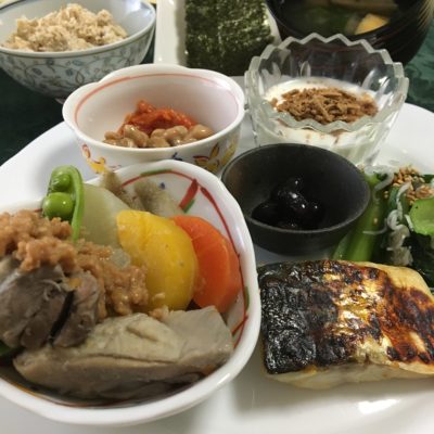 鶏肉と根菜煮に肉味噌とエンドウ、鯖の西京味噌焼、小松菜のしらす和え、黒豆、キムチ納豆、ヨーグルトとシリアル。