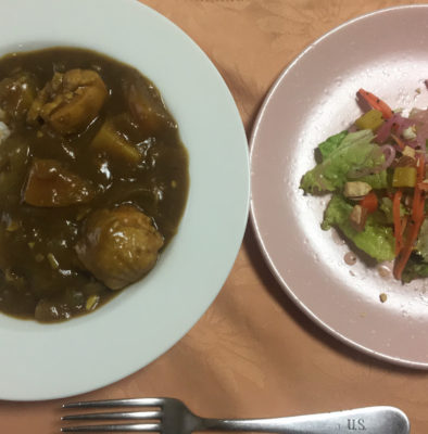 チキンカレーライス、野菜サラダ。