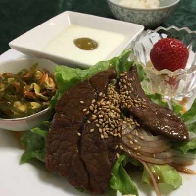 焼肉サラダ、好き昆布の煮物、ヨーグルトと冷凍シャインマスカット、いちご。