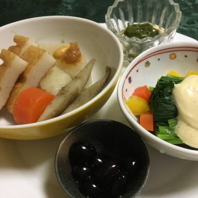 ふくだちのワサビマヨネーズと人参の甘煮、根菜と薩摩揚げの煮物、黒豆煮、メカブの生姜酢。