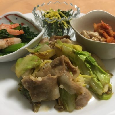 春キャベツと豚モモの生姜焼き、海老と小松菜のナムル、ふくだちの胡麻和え、キムチ納豆。