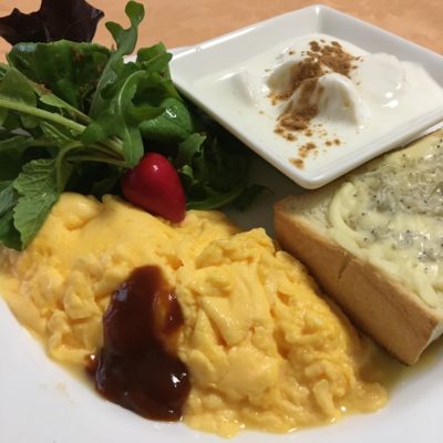 シラスチーズトースト、スクランブルエッグ、レタスとラディッシュのサラダ、ヨーグルトとバナナ。