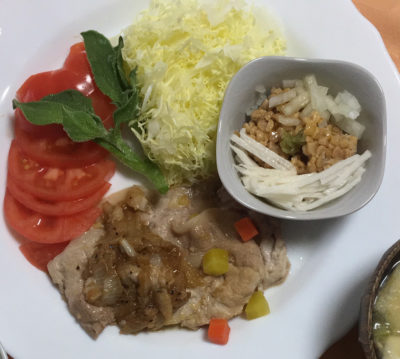 豚の生姜焼き、千切りキャベツとアイスプラント、スライストマト、長芋と玉葱納豆。