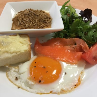 目玉焼き、スモークサーモンとリーフサラダにトマト、ヨーグルトとシリアル、シラスチーズトースト。