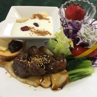 焼肉と焼エリンギ、小松菜のお浸し、レタスとパプリカのサラダにプチトマト、紫キャベツとシラスのサラダ、ヨーグルトにバナナとレーズン、いちご。