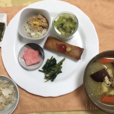 ほうれん草の胡麻酢和え、春巻き、玉葱納豆、カブのお漬物、ヨーグルトとキウイフルーツ。
