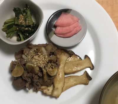 エリンギと牛肉の大蒜ソテー、ほうれん草の胡麻和え、カブのお漬物。