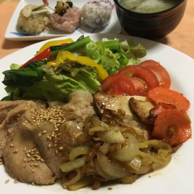 豚モモの生姜焼き、焼野菜、サラダ、トマト、炊き込みご飯のおむすび。