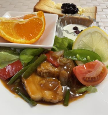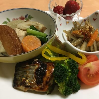 鯖の西京味噌焼、野菜サラダ、おでん、金平ごぼう、いちご。