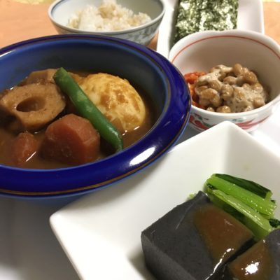 八丁味噌の煮込みおでん、黒胡麻豆腐と小松菜のお浸し、キムチ納豆。