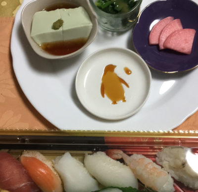 握り寿司、枝豆豆腐、小松菜の酢味噌がけ、カブのお漬物。