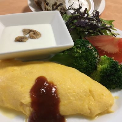 オムレツ、ブロッコリーとトマト、リーフサラダ、ヨーグルトとドライイチジク、ミニカマンベールチーズ。