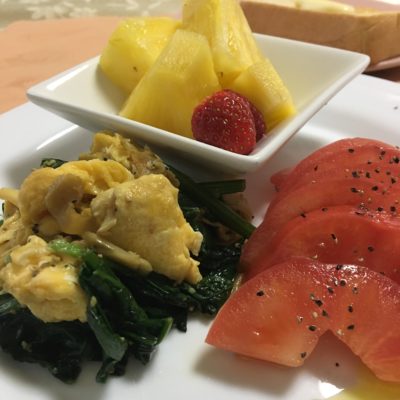 ほうれん草と卵のニンニク炒め、トマトサラダ、パイナップルといちご。