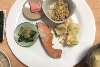 焼鮭、コンキリエのサラダ、ほうれん草のナムル、玉葱納豆、カブのお漬物。