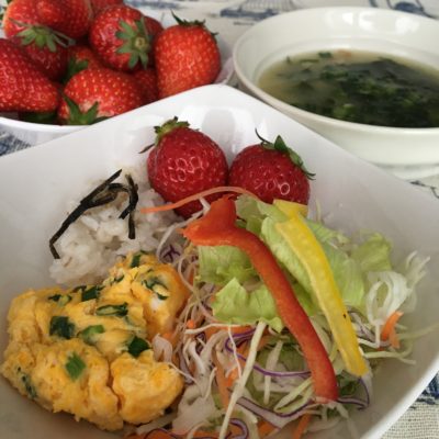 巾着玉子、野菜サラダ、いちご。