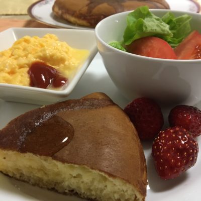 パンケーキ、スクランブルエッグ、野菜サラダ、いちご。