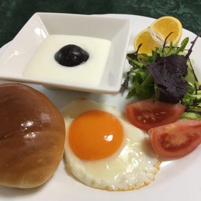 バターロール、目玉焼き、リーフサラダ、ブロッコリーとトマト、黄金柑、ヨーグルトと冷凍巨峰。