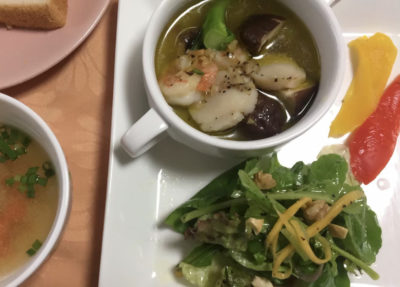 海鮮ときのこののアヒージョ、リーフサラダ、パプリカのピクルス、コンソメスープ。