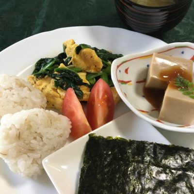 おむすびと焼き海苔、ほうれん草と卵のニンニク炒め、トマト、胡麻豆腐。