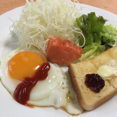 目玉焼き、厚切りのスモークサーモン、千切りキャベツとレタス、小松菜のお浸し。