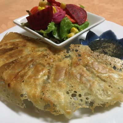 鶏皮の焼鶏風炒めとレタス、菊のお浸し、冷や奴、紅ショウガ入りのがんもどきと小松菜のお浸し。