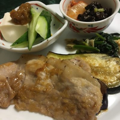 豚モモの生姜焼き、焼野菜、ニラの味噌炒め、豆腐と胡瓜の味噌添え、キムチ黒豆納豆。