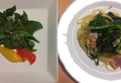 ふくだちのペペロンチーノ、野菜サラダ、パプリカのスイートピクルス。