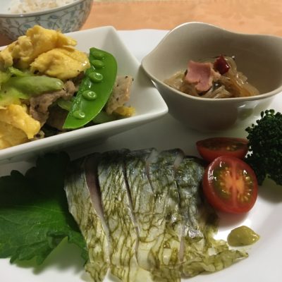 しめ鯖、プチトマトとブロッコリー、春キャベツの卵炒め、糸こんにゃくとベーコンの煮物。