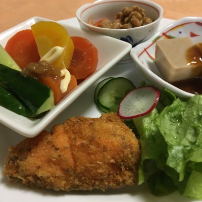 コッドフライ、レタスサラダ、野菜の味噌がけ、胡麻豆腐、キムチ納豆。