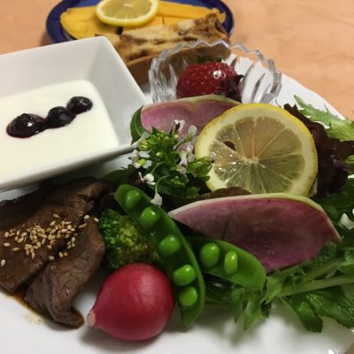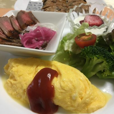 オムレツ、ローストビーフと紫玉葱のピクルス、野菜サラダ、ヨーグルトと冷凍いちご。