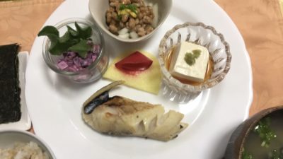 銀鮭の西京味噌焼、冷や奴、ビーツのサラダとアイスプラント、自家製沢庵と紅大根のピクルス、玉葱納豆。