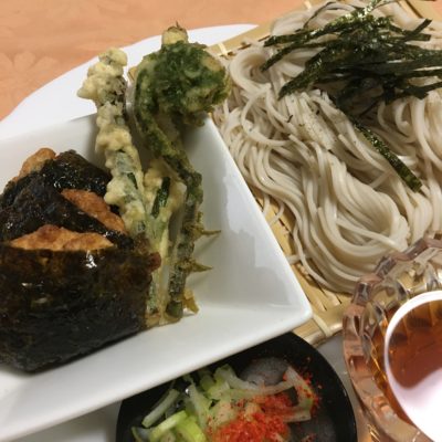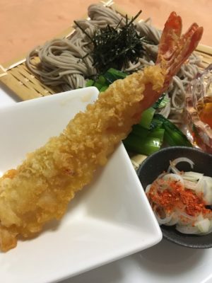 海老天麩羅、ざる蕎麦、小松菜のお浸し。