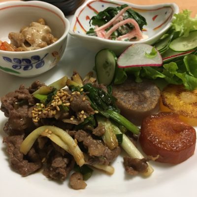 牛肉のにんにくの芽炒め、紫・黄・橙の焼人参、野菜サラダ、ほうれん草とカニカマ和え、キムチ納豆。