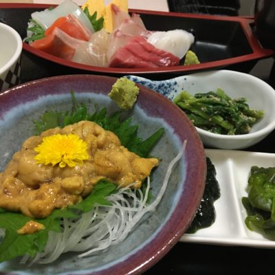 生ウニ、お刺身、青海苔の佃煮、ほうれん草の胡麻和え。