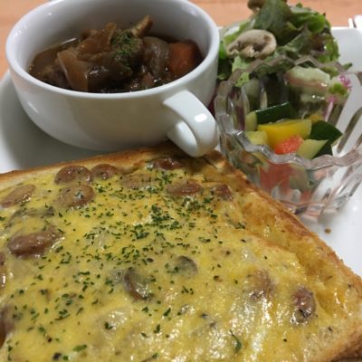 スペアリブの八丁味噌煮込み、パンキッシュ、人参と胡瓜のサラダ、マッシュルームのサラダ。