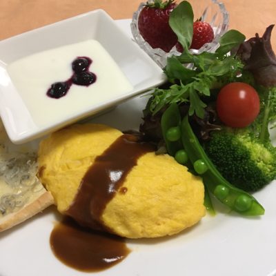 オムレツ、シラスチーズトースト、ヨーグルトとブルーベリジャム、いちご。