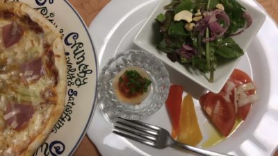 ベーコンピザ、野菜サラダ、スライストマト、パプリカのスイートピクルス、煮玉子。