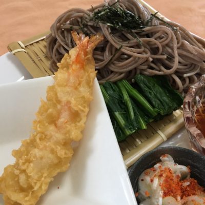 海老天麩羅、ざる蕎麦、小松菜のお浸し。