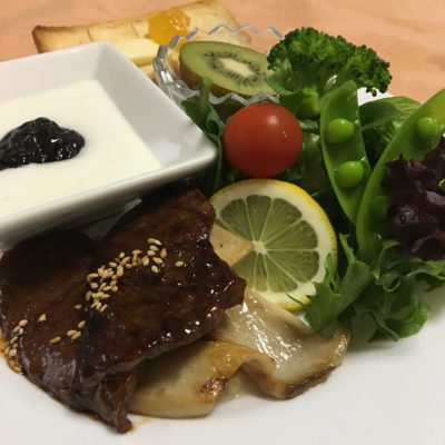 カルビ焼肉、焼きエリンギ、野菜サラダ、ヨーグルトとプルーン、キウイフルーツ。