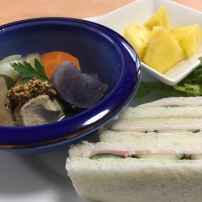 ハムサンドウィッチとレタス、ポトフ、パイナップル。