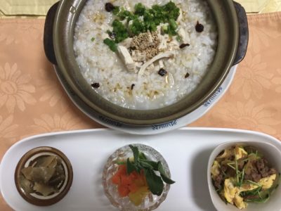 中華粥、搾菜、人参サラダとアイスプラント、牛肉と豆苗の卵炒め。