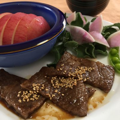 カルビ焼肉、アイスプラントに紅大根とエンドウ、りんご。